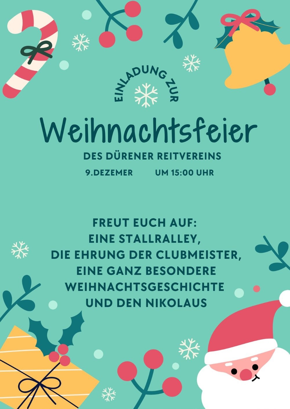 Beginn ist um 15 Uhr und den Nikolaus erwarten wir gegen 17 Uhr im Stall. Eingeladen sind alle Freunde und Mitglieder des Dürener Reitervereins